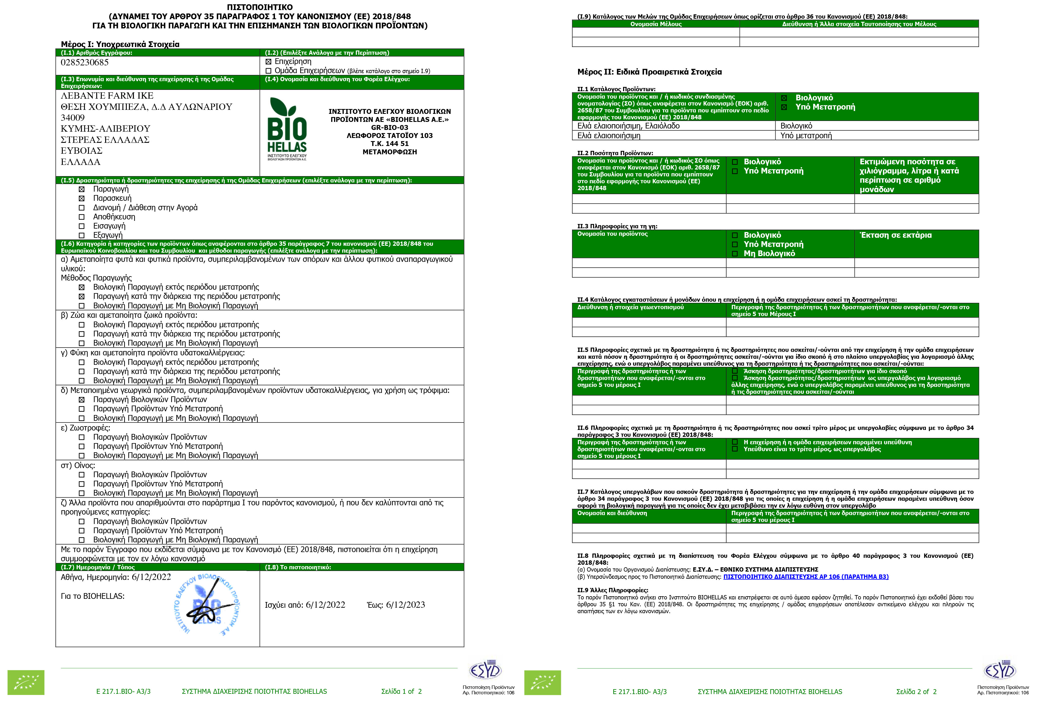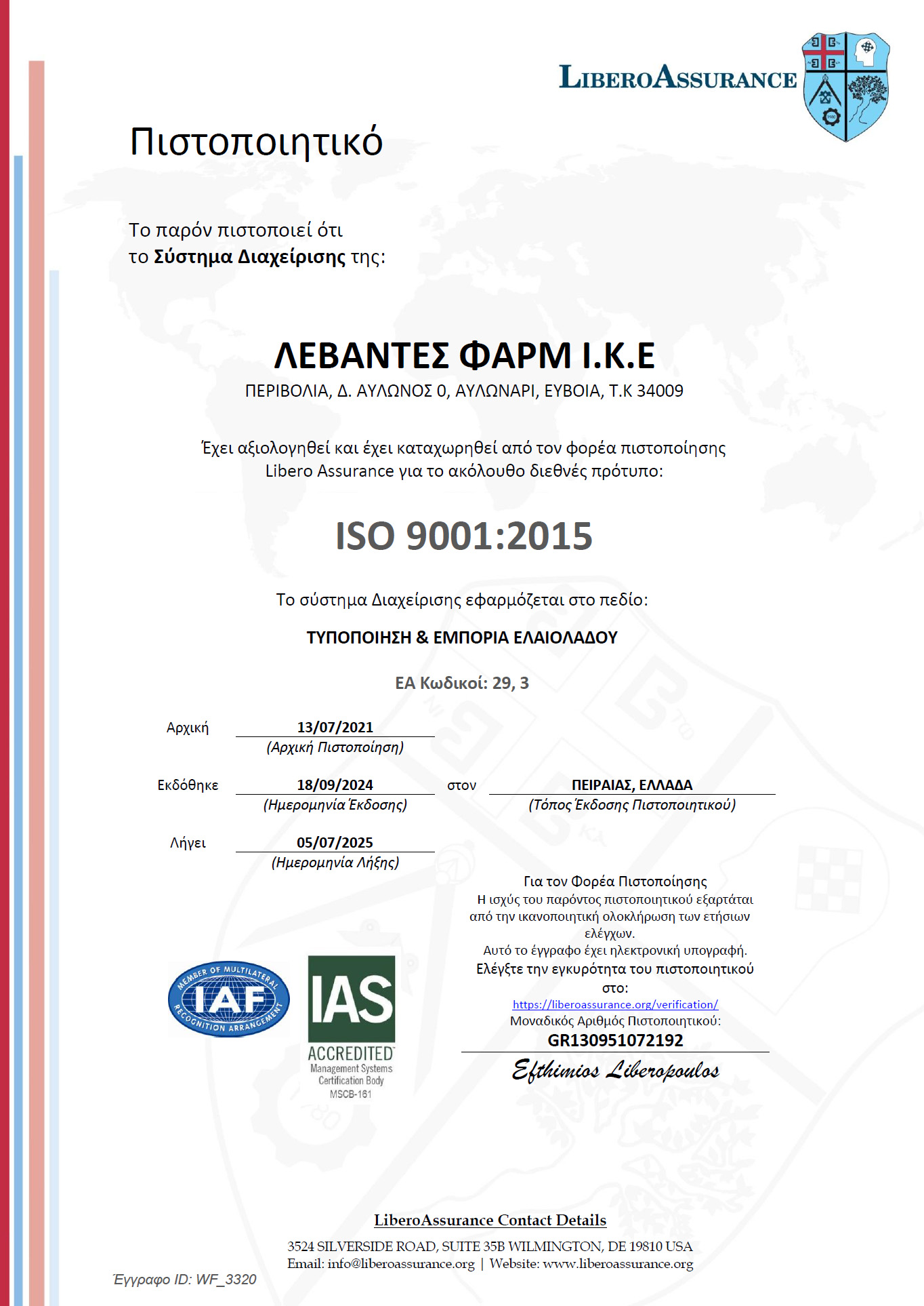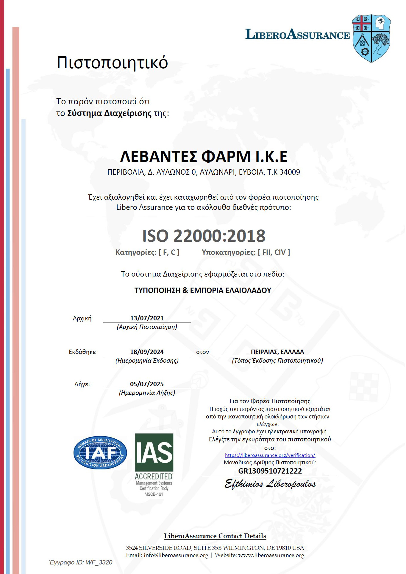 Η εταιρεία λειτουργεί με βάση τα πρότυπα ISO 22000: 2005 και ISO 9001: 2015.